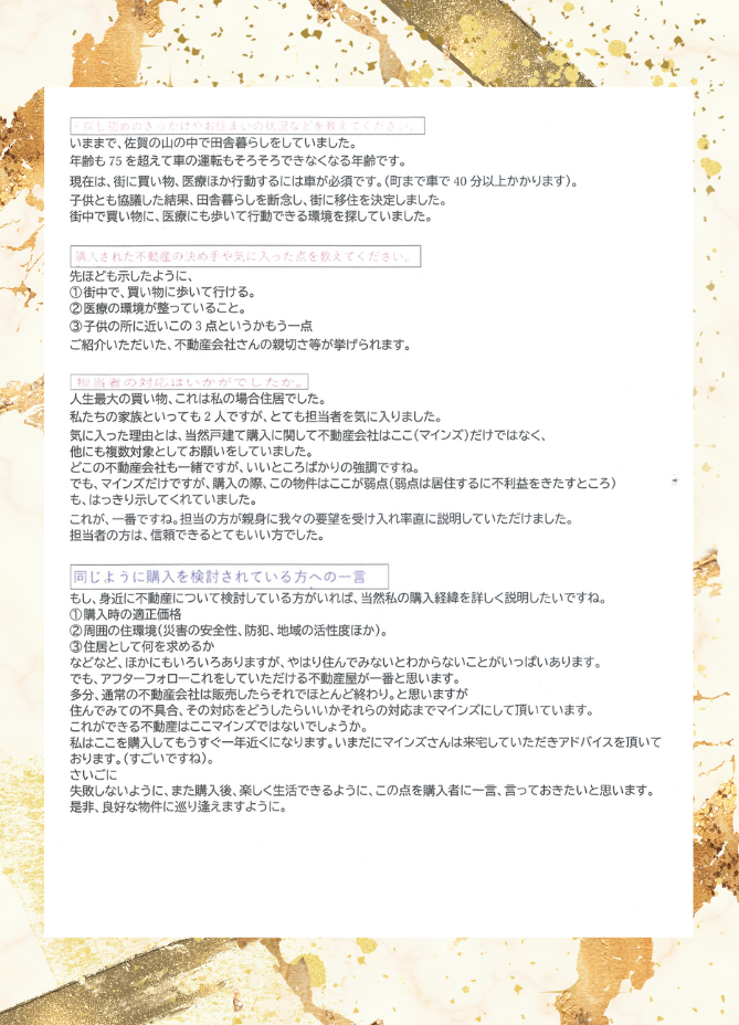 でも、マインズだけですが、購入の際、この物件はここが弱点(弱点は移住するに不利益をきたすところ)も、はっきり示してくれていました。これが一番ですね。担当の方が親身に我々の要望を受け入れ率直に説明していただけました。担当者の方は、信頼できるとてもいい方でした。