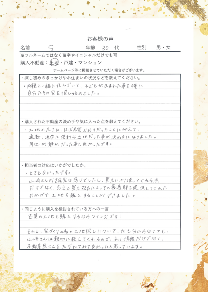 山﨑さんが誠実な感じでしたし、買主に寄り添ってくれる点だけでなく、売主と買主双方にとっての最適解を提供してくれたおかげで土地を購入することができました。